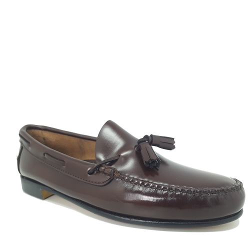 Este zapato castellano burdeos con adorno borlas está hecho a mano con piel Antik de 2,3 mm de grosor, en un elegante tono corinto que aporta distinción y estilo. Los cosidos entre carne refuerzan su estructura y garantizan una excelente durabilidad, manteniendo el toque artesanal en cada detalle.