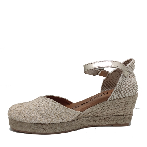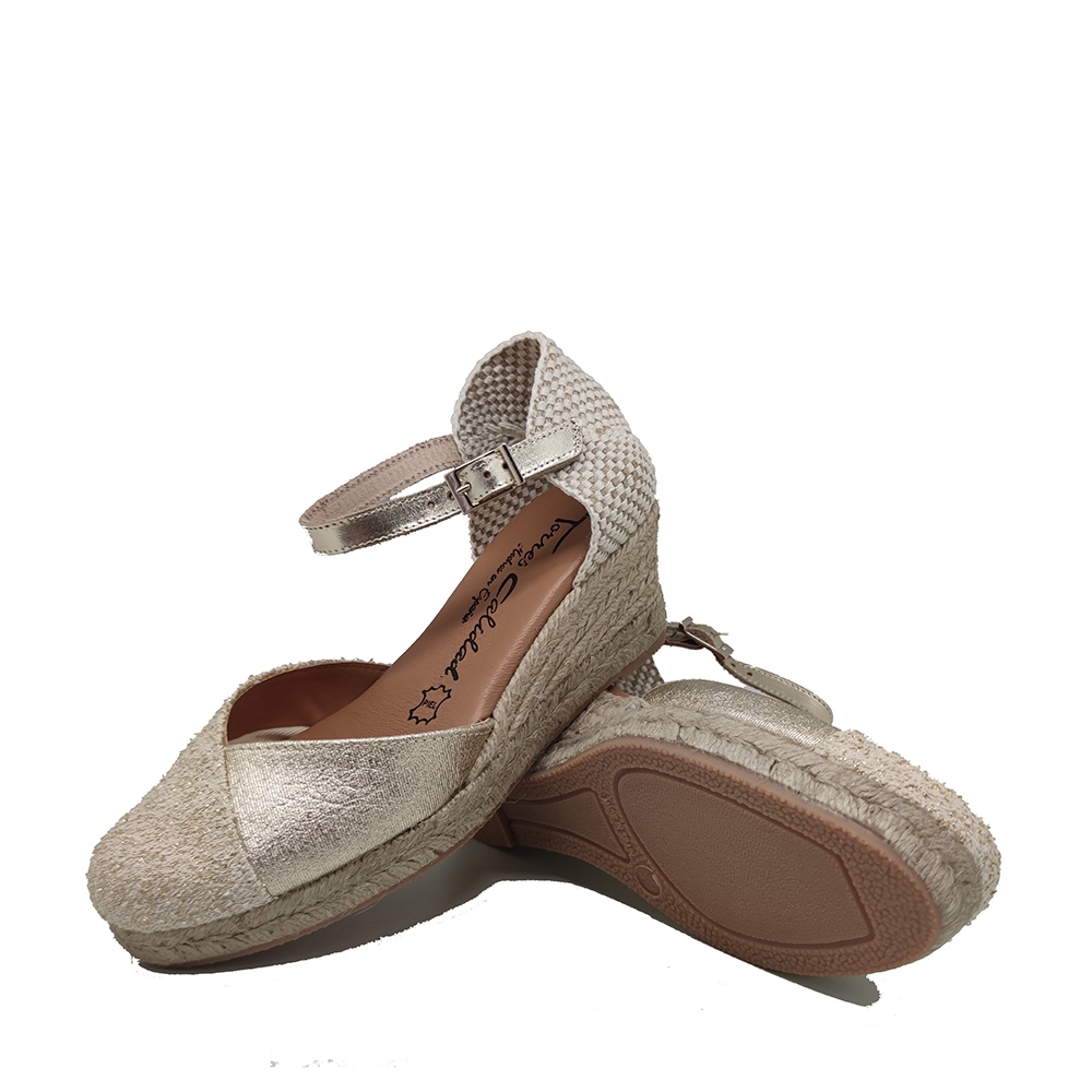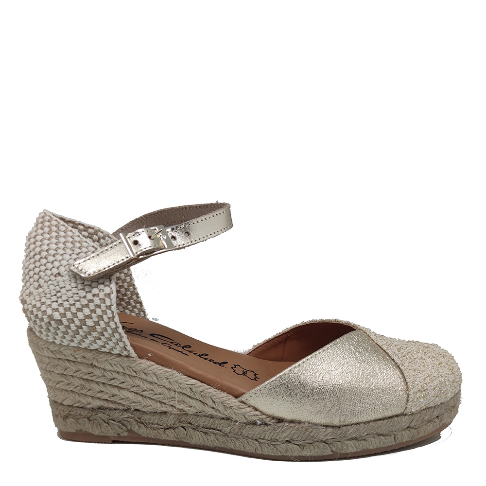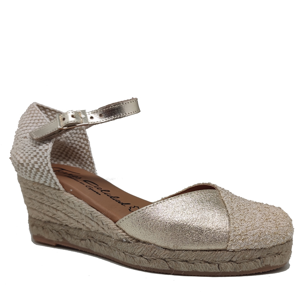 Alpargatas de mujer con cuña de esparto , con puntera cerrada corte en pico combinada en piel y tejido dorado. color dorado, combinado con tira de piel con ciere de hebilla, plantilla de piel muy blandita ya que incorpara gel. Fabricadas en España por Torres