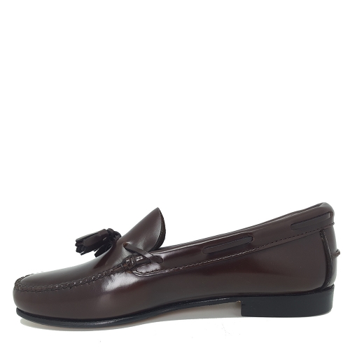 Zapato castellano adorno Borlas, hecho a mano con cosidos entre carne en piel antik con grosor de 2,3mm color marron oscuro, piso cuero cosida.