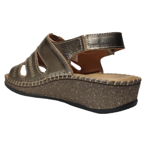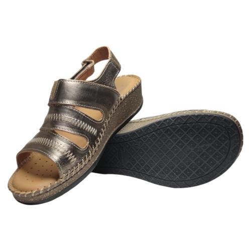 Sandalia mujer en color Dorado con tira Adhesivas auto ajustables en el talon que dan una sujeción total al pie sin lastimarlo. Fabricadas en piel forradas y con la plantilla de Gel. Suela de goma con una cuña 3,5 Cm antideslizante. Fabricadas en España por la marca S@kut.